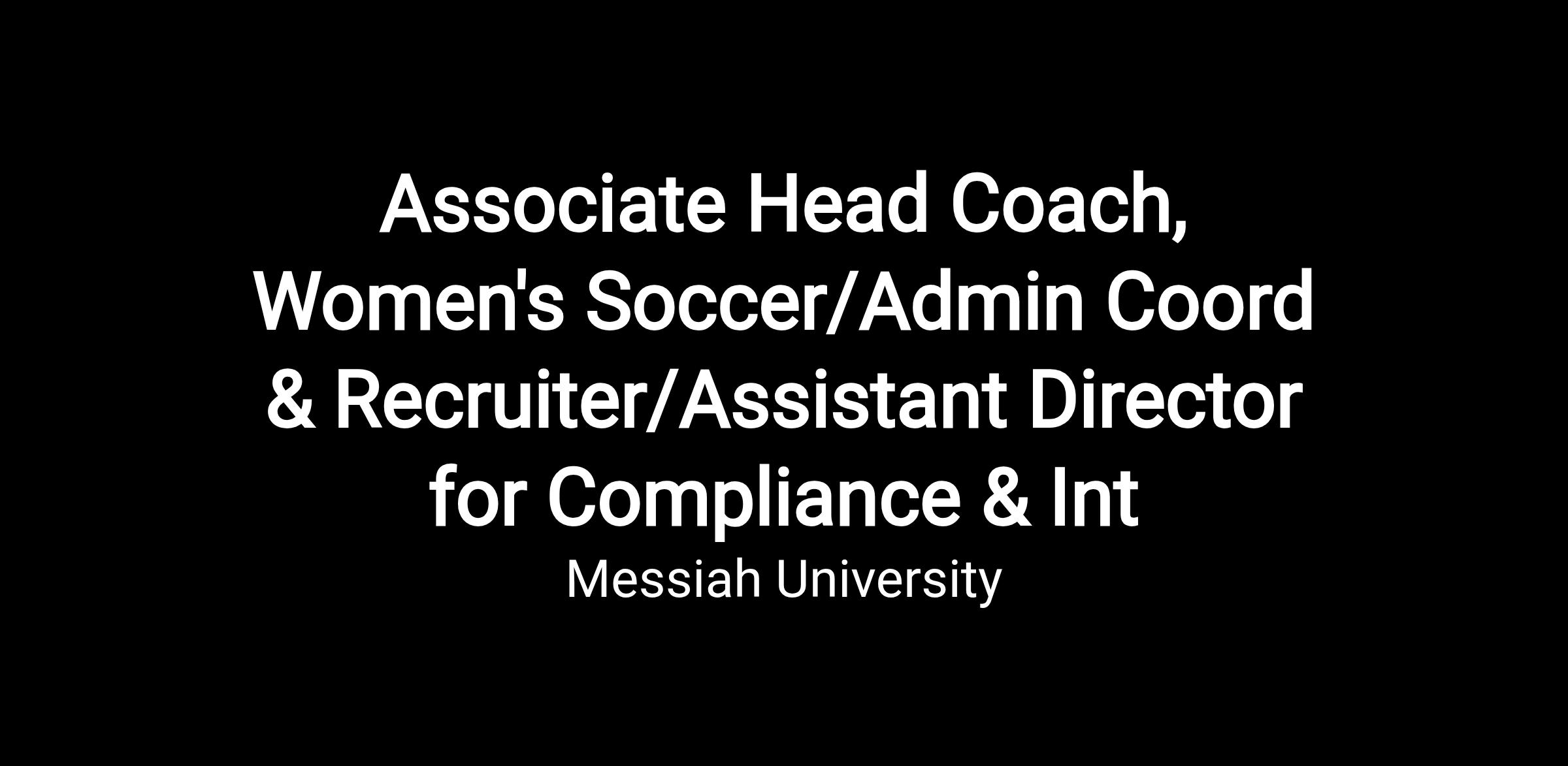 Primary Duties: Associate Head Coach Analyze performance and instruct athletes in skills, techniques and strategies in preparation for competition and during contests. Hold significant responsibilities in the coordination of general administrative duties (including budgeting, game scheduling, travel plans, meeting requests for information, hiring of officials, and business procedures). Communicate with the athletic trainer, athletics communication director, facilities assignor, and department administrators. With the head Coach plan, organize, implement, and evaluate prospective student-athletes. Plan and execute all on campus recruiting activities. Give support to the scouting and strategic objectives of the women's soccer team. Assist the Associate/Assistant Athletics Directors in matters for which he/she is responsible including ordering and inventorying of equipment, and maintenance and use of facilities for contests and practices. Adhere to and follow all rules and guidelines of Messiah University, Middle Atlantic Conference and the NCAA. Maintain consistent and reliable attendance. Assistant Director for Compliance & Internal Operations Other duties as assigned. Assist the Assistant Director of Athletics for Internal Operations Director with NCAA compliance oversight and implementation. Assist with completing the annual reports for the Equity in Athletics Disclosure Act (EADA) and NCAA Sponsorship and Demographic form. Management of facility Private Seat Licenses (PSLs) (e.g., Shoemaker Field, Hitchcock Arena) and Online Ticketing System. Game Management supervision and serve as NCAA post-season tournament director.