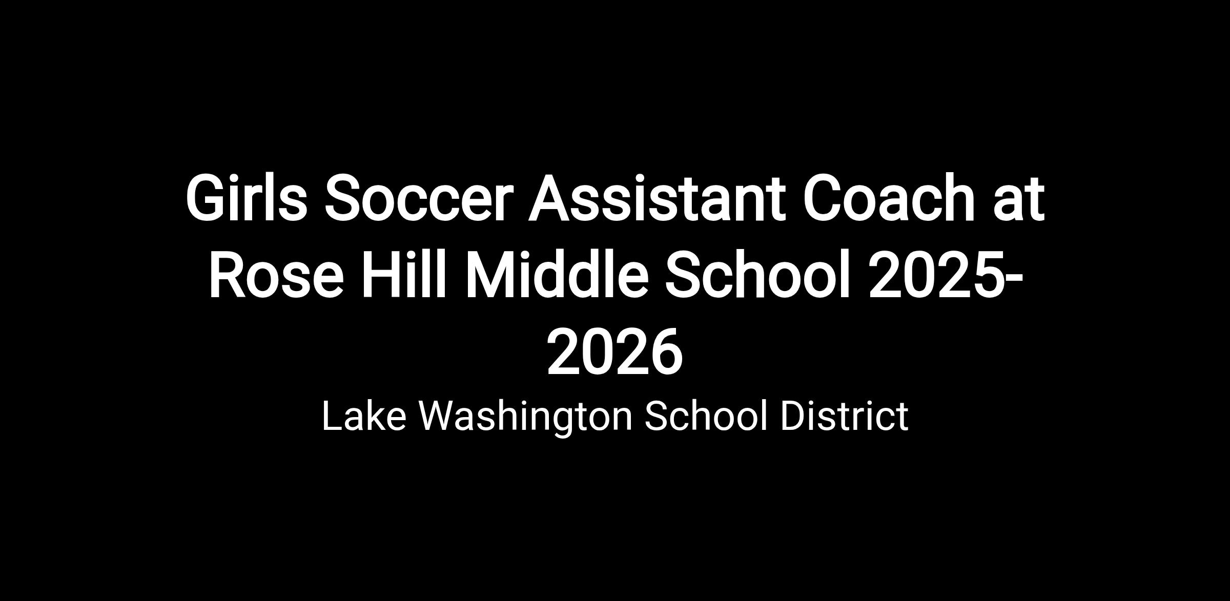 Rose Hill Middle School (within the Lake Washington Learning Community) is seeking qualified candidates for a position as a Girls Soccer JV Head Coach for the 2025-26 school year. This is an assistant coach level position that will lead the JV team and assist the Varsity Head Coach. Practices 2:30-4pm M-F (except Wednesdays). Seven scheduled games will run longer, typically finishing between 5-6pm. Most practices and games will be held at Grass Lawn Park.