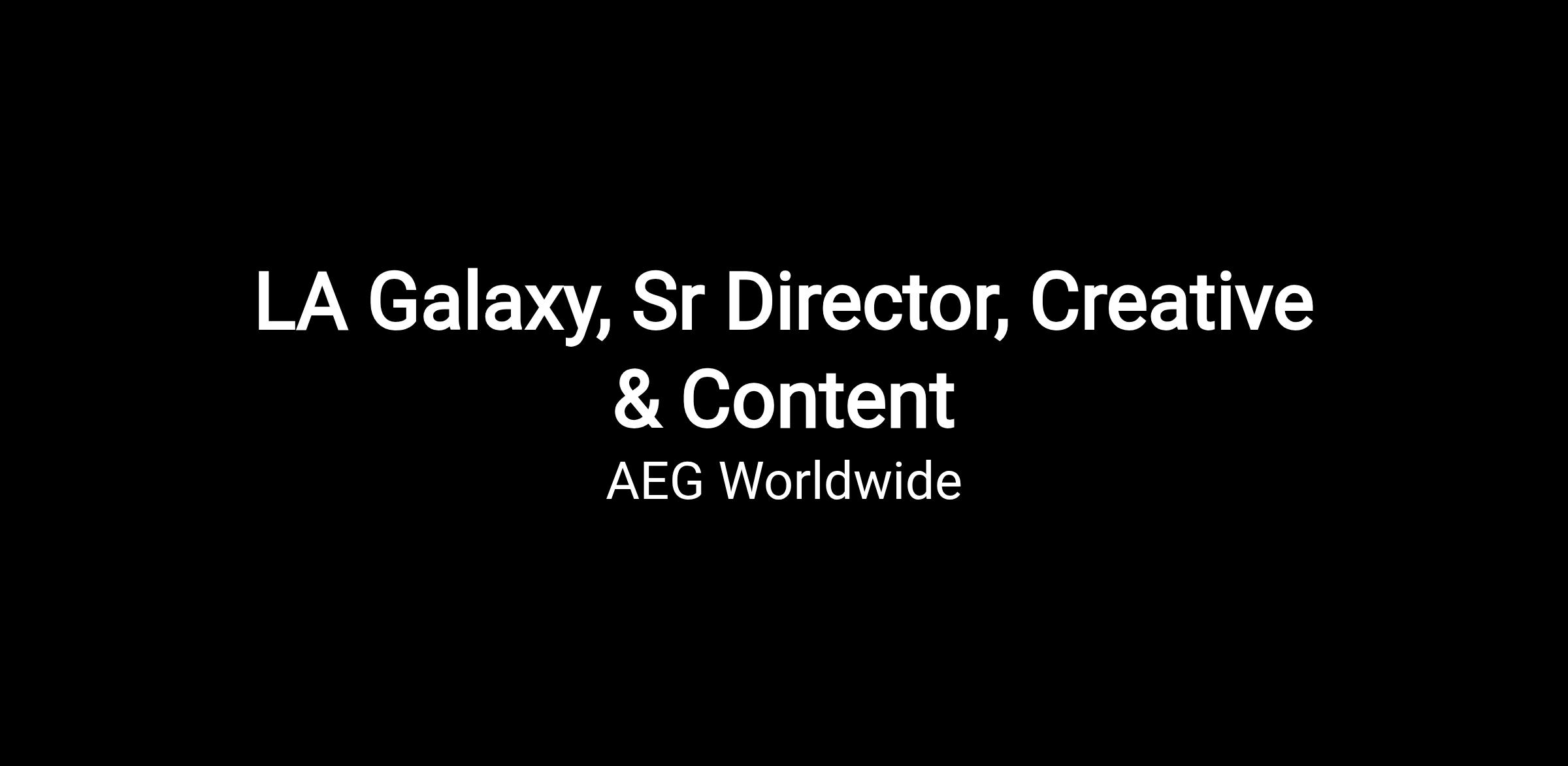 - Oversee the enterprise wide creative and content ecosystem for the LA Galaxy, LA Galaxy II, LA Galaxy Academy, and Dignity Health Sports Park, setting the long term creative vision and ensuring all visual communication aligns with organizational brand, marketing, and business strategies. This includes executive leadership of all creative concepts across paid advertising (TV, print, radio), online marketing, website, social media, in venue platforms (videoboards, LED ribbons, stadium signage), and event environments (activation spaces, branding, and giveaways).