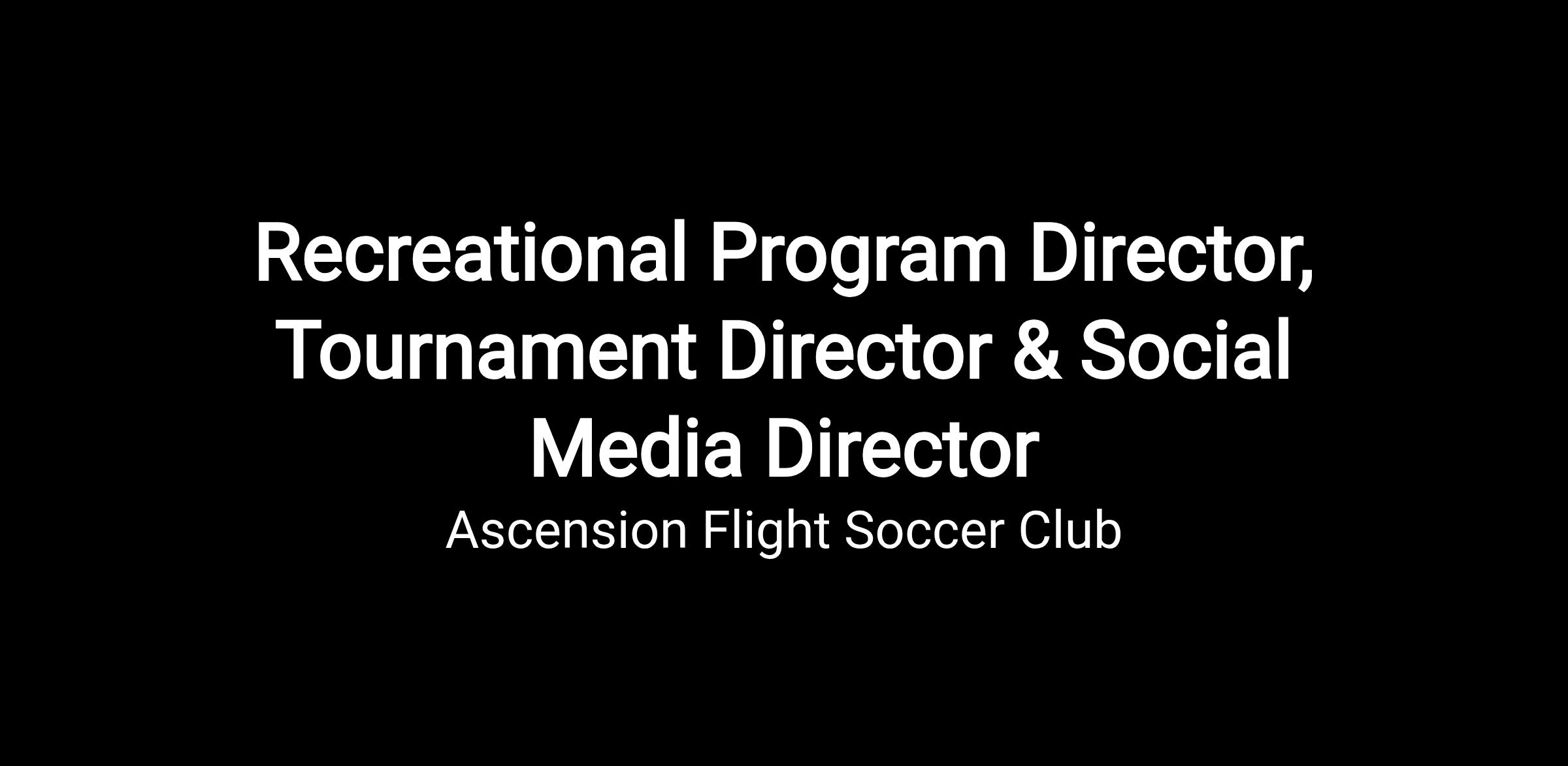 The Ascension Flight Recreational, Tournament & Social Media Director will lead the entire process of the Recreational program and our 2 annual tournaments. The Recreational Director will oversee the customer service, registration, creation of teams and game schedules for the Flight members. The Flight Tournament Director will oversee the registration, the creation of schedules and all tournament decisions for our Fall and Spring tournaments. In addition to this, the Director will oversee all social media platforms, including creating content, graphics, and media to promote the club, its programs, and events.